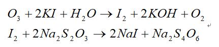 方法原理:一般采用化學碘量法。利用臭氧與碘化鉀的氧化還原反應(yīng),置換出與臭氧等當量的碘。再用硫代硫酸鈉與碘作用,以淀粉為指示劑,待完全反應(yīng)生成無色碘化鈉。根據(jù)硫代硫酸鈉的消耗量計算出臭氧濃度。其化學反應(yīng)方程式如下:
