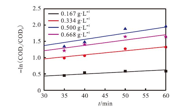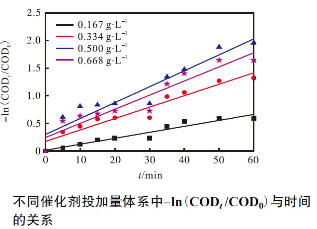 圖3 不同催化劑投加量體系中-ln(CODt /COD0)與時間的關系