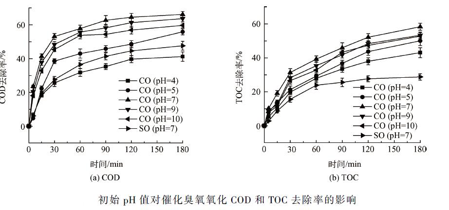 由圖1可知,催化臭氧氧化(catalytic ozonation,CO)的COD 去除率可以達到(66. 2 ± 1. 7)% ,比單獨臭氧氧化(single ozonation,SO) 的(47. 6 ± 2. 6)% 提高了近20 個百分點;而TOC 去除率則可以達到(58. 4 ± 2. 1)% ,比單獨臭氧氧化的(28. 8 ± 1. 9)% 提高了近1 倍。調節廢水pH 值,無論是酸性(pH = 4,5),還是堿性(pH = 9,10),催化臭氧氧化的效果都不如中性(pH = 7)的效果好,這可能是因為羥基氧化鐵的零電荷點(pHpzc )在中性附近,過酸和過堿都影響了羥基氧化鐵表面羥基的電荷形態。需要注意的是:當pH = 4 時,COD 的去除率不如單獨氧化的,但TOC 的去除率卻比單獨氧化的高。這是因為單獨臭氧氧化很難降解煤化工生化出水中的難降解有機物,從而TOC去除率低;而pH = 4 時催化臭氧氧化一定程度上降解了這部分難降解有機物,甚至是難以測出COD 的有機物,但效果沒有中性和堿性條件下的好,依然有一部分降解不完全,反而被檢測出COD,從而COD 的去除率反而降低。