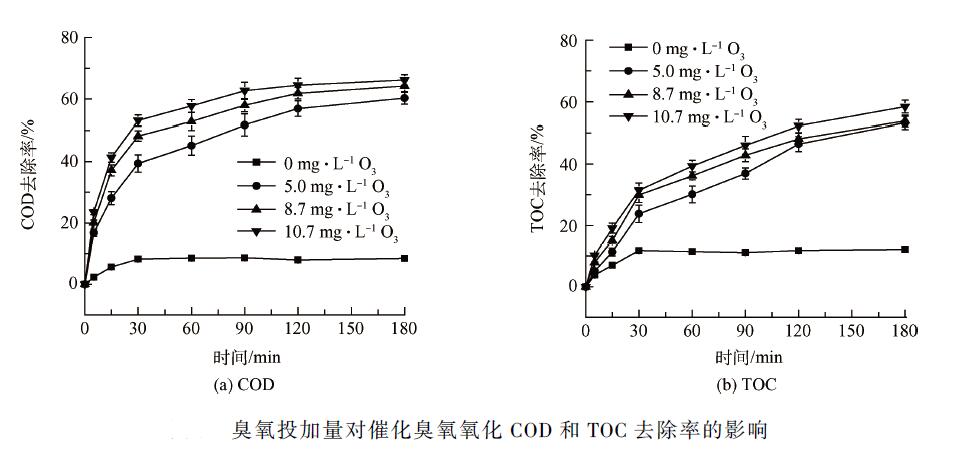 臭氧是有機物降解的直接動力,其投加量直接影響催化臭氧氧化的速率及效果。實驗通過調節所用臭氧發生器電流檔位改變臭氧投加量,并用碘量法測出臭氧產生量。廢水不調節pH 值(中性),催化劑投加量為200 g·L - 1 。由圖3 可知,不通臭氧,單純通空氣時,催化劑對廢水只有吸附作用,此時COD 和TOC 的去除率僅有(8. 6 ± 0. 3)% 和(12. 1 ± 0. 4)% 。增大臭氧投加量對COD 和TOC 的去除率的提有限,這可能與臭氧的利用率有關,有效利用的臭氧較少,但增大臭氧投加量,有利于三相界面的傳質,反應速率更快,特別是在短時間內效果顯著。