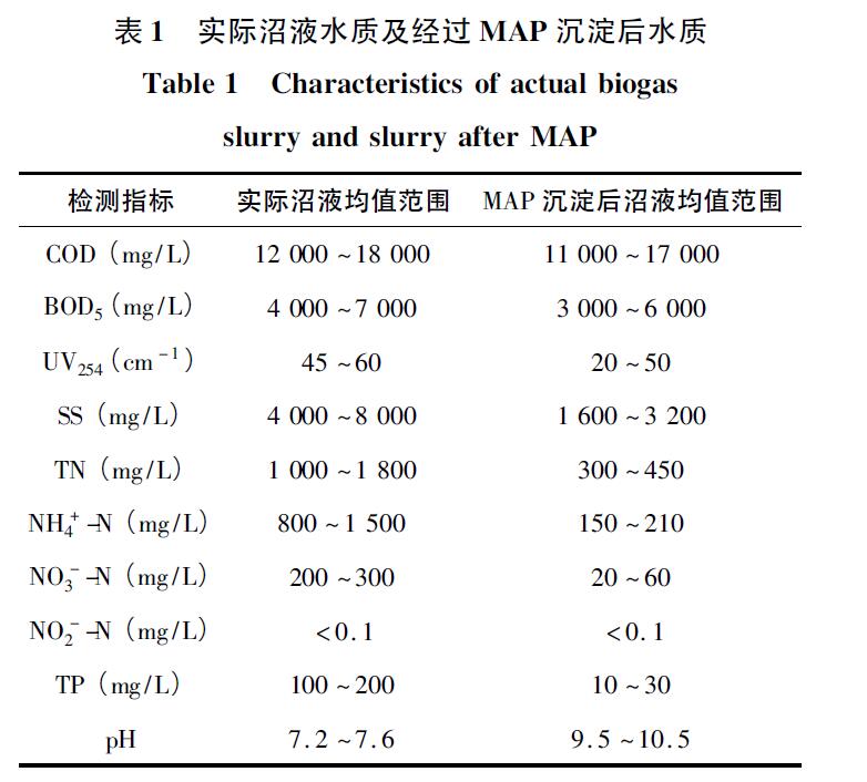 實(shí)驗(yàn)所用厭氧沼液取自陜西省楊凌示范區(qū)某產(chǎn)業(yè)集團(tuán)生豬實(shí)訓(xùn)基地。該場(chǎng)生豬出欄量為18 萬(wàn)頭/a,豬場(chǎng)廢水主要來(lái)自糞尿、豬舍沖洗水,豬場(chǎng)廢水由露天排水溝匯入?yún)捬跽託獬刂校M(jìn)行1 ~ 2 個(gè)月厭氧發(fā)酵。厭氧發(fā)酵后的沼液以MgCl2和Na2HPO4為沉淀劑,進(jìn)行MAP 沉淀反應(yīng)前處理。實(shí)際沼液水質(zhì)及經(jīng)過(guò)MAP 沉淀后水質(zhì)情況如表1 所示。