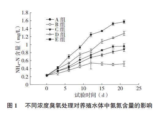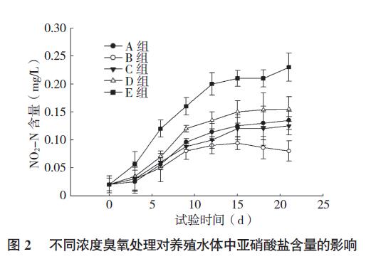 由圖1、圖2 可知,各組水體氨氮和亞硝酸鹽含量都呈上升趨勢。與對照組(E 組)相比,經(jīng)過臭氧處理水體中的氨氮和亞硝酸鹽含量上升緩慢,可見臭氧對水體中的氨氮和亞硝酸有明顯的降解效果。B 組(0.1 mg/L 臭氧)水體的氨氮和亞硝酸鹽含量顯著低于其他幾組,而A 組(0.05 mg/L 臭氧)水體的氨氮含量和亞硝酸鹽含量雖然與C 組(0.15 mg/L 臭氧)相比差異不顯著,但高于C 組??梢?,較低濃度臭氧對水體中氨氮和亞硝酸鹽降解效果不顯著,但其濃度也不是越高越好。