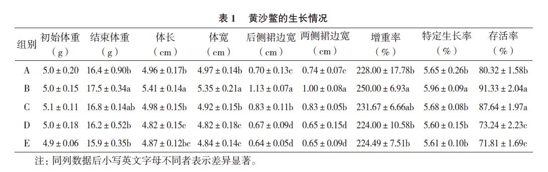 試驗期間,每隔3 d 從池中取樣測量水質(zhì),測定其溶解氧、氨氮含量、亞硝酸鹽含量,試驗周期為21 d。試驗結(jié)束時,統(tǒng)計各組黃沙鱉的存活數(shù)量。并隨機(jī)從水池中取出10 只黃沙鱉,測量其體重、體長、體寬、裙邊寬度,其中后側(cè)裙邊寬度為背甲 很長線上背甲邊到裙邊邊緣的距離;兩側(cè)裙邊寬度為背甲 很寬線上背甲邊到裙邊邊緣的距離。