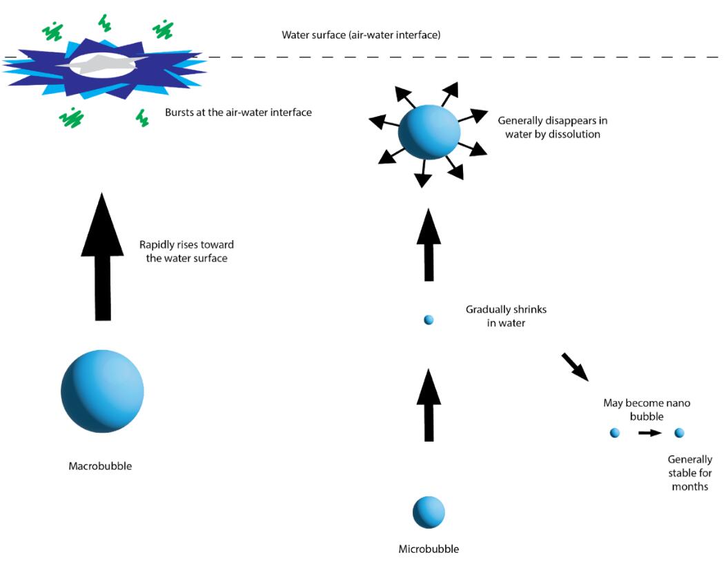 與大氣泡不同,納米氣泡不會由于浮力而上升到水面。與微氣泡不同,納米氣泡不會通過溶解到水中而消失在水中,而是保持納米氣泡(超細(xì))氣泡狀態(tài)。在液體中壽命長的納米氣泡會隨機(jī)移動,而不是像較大的氣泡那樣向上移動。這種隨機(jī)的,有時是橫向的,有時是垂直的,甚至是向下的現(xiàn)象被稱為布朗運(yùn)動。