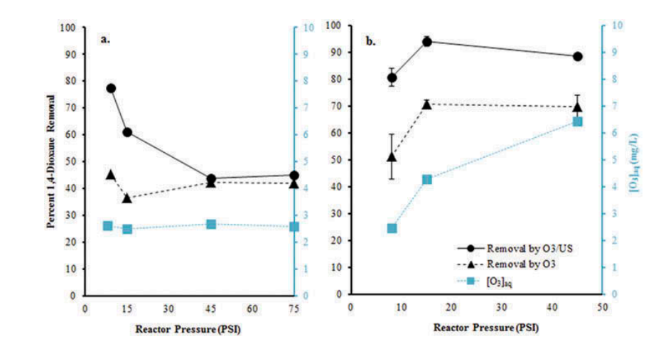 恒定水臭氧濃度的結果(圖4a.)表明,從臭氧中單獨去除二氧六環相對不受反應器壓力的影響。在反應器壓力(壓力表)從8到75磅/平方英寸(PSI)(0.55到5.2 bar)范圍內,單獨使用臭氧(2.5 mg/L)可產生約42%的二氧六環去除率。然而,在臭氧/超聲系統中,在低壓下獲得了顯著更高的去除率。隨著壓力的增加,協同作用逐漸減弱,在75 PSI(壓力表)時,聯合系統中二氧六環的去除趨向于臭氧系統中的去除。
