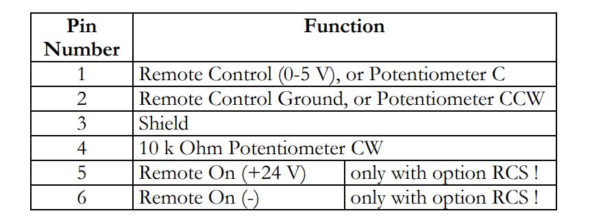 可選的儀器可以訂購6針遙控連接器(綠色),而不是電位器。